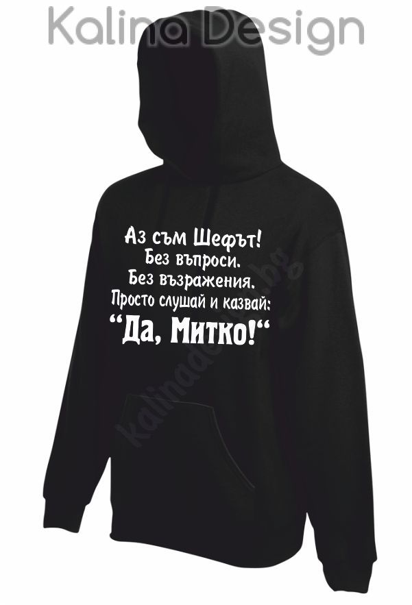 Суитчър със забавен надпис - Аз съм Шефът....Да, Митко! Прекрасен подарък за всеки повод - Димитровден, рожден ден, Коледа и Нова година, юбилей, Деня на Бащата и др.