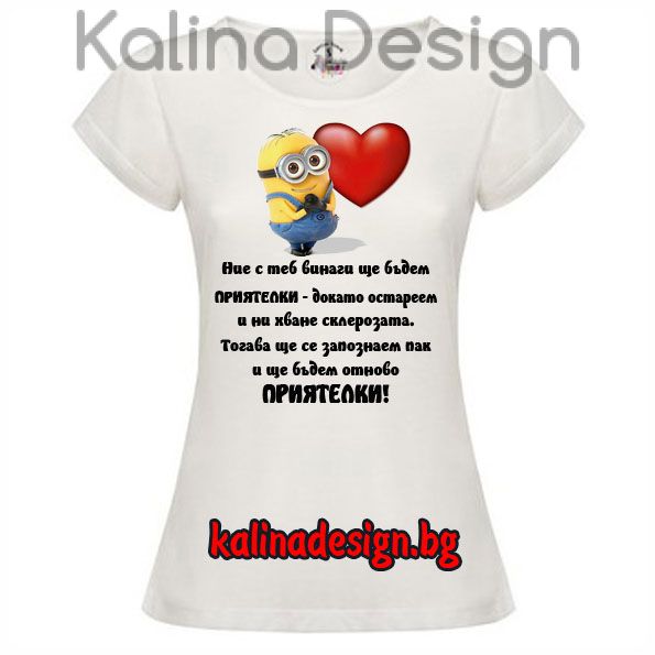 Тениска със забавен надпис за Приятелки и миньони вариант 2. Прекрасен подарък за всеки повод - имен ден, рожден ден, Коледа и Нова година, юбилей и др. Тениска 100% полиестер, българско производство. Цвят: бял;