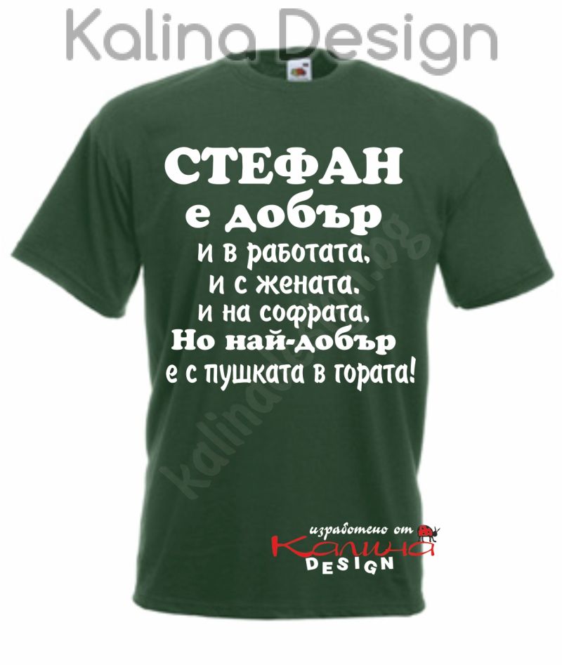 Забавна тениска за Ловци с надпис "Стефан е добър...., но най-добър е с пушката в гората" Чудесен подарък за всички ловци с чувство за хумор - за имен ден, рожден ден, юбилей, откриване на ловния и риболовен сезон и други поводи.