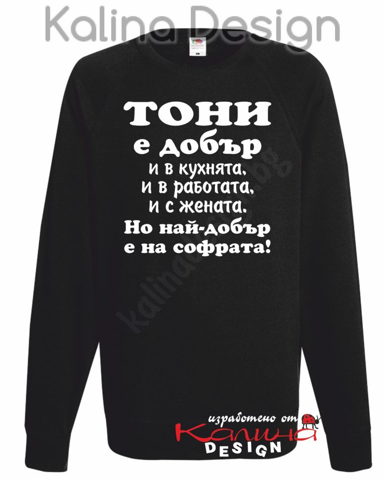 Ватирана блуза със забавен надпис - ТОНИ е добър.....Но най-добър е на софрата! Прекрасен подарък за всеки повод - имен ден, Антоновден, рожден ден, Коледа и Нова година, юбилей, Деня на Бащата и др.