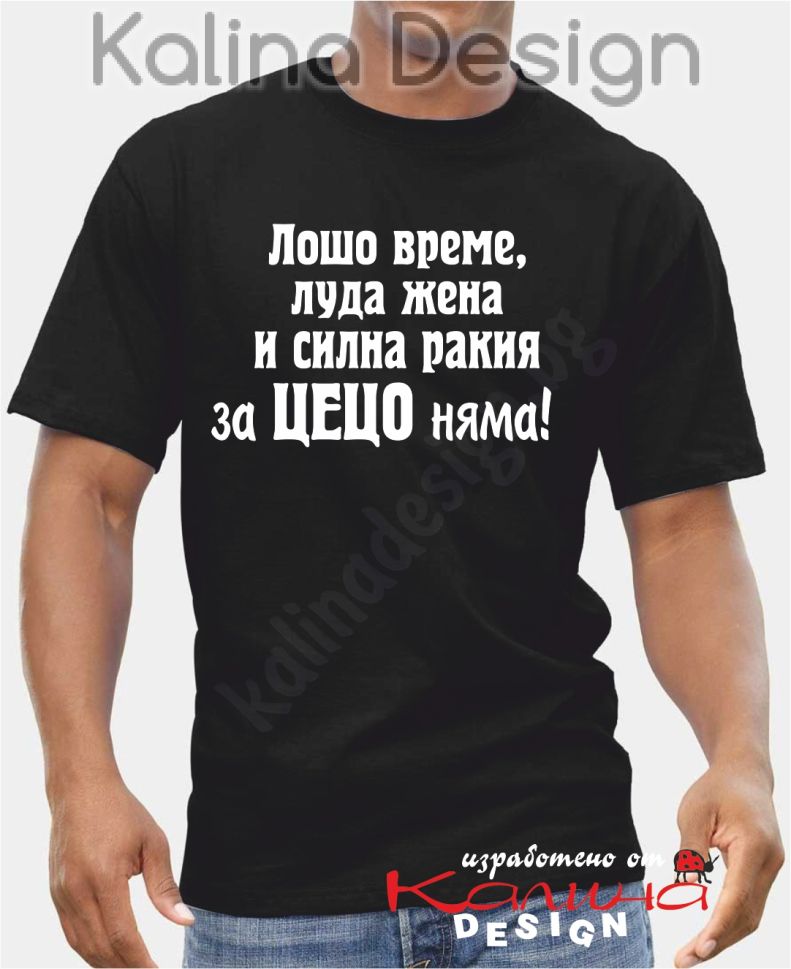 Тениска със забавен надпис - Лошо време, луда жена и силна ракия за ЦЕЦО няма!