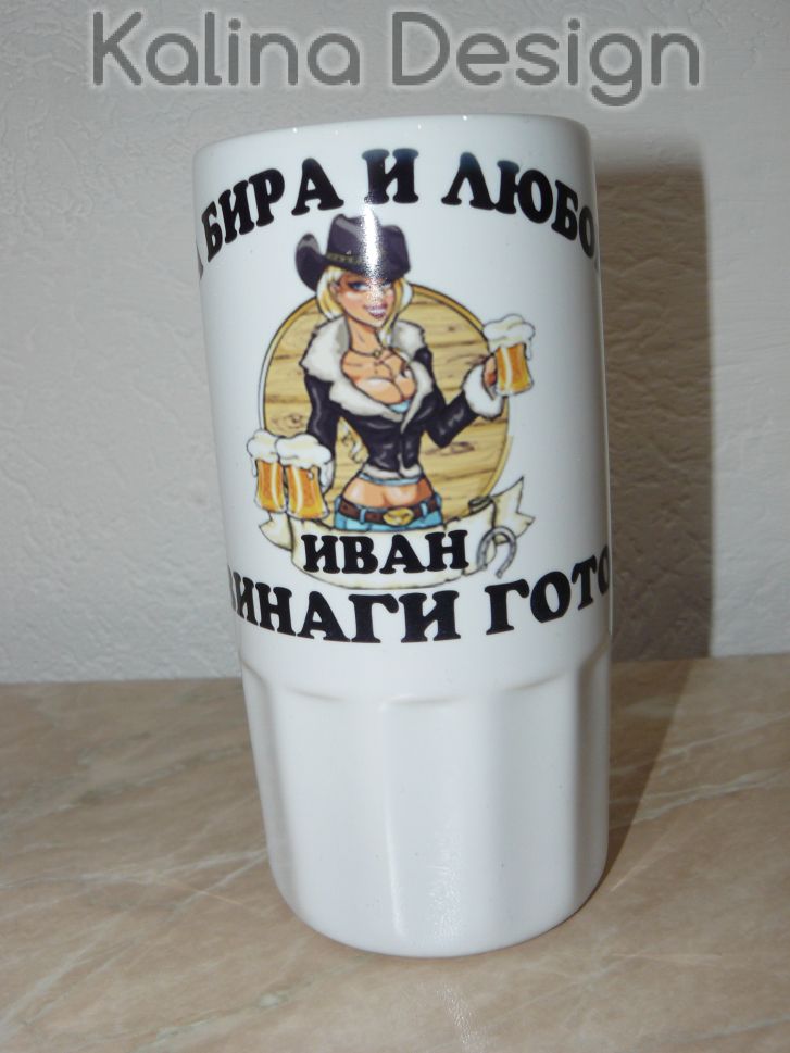 Порцеланова халба за бира с надпис - За БИРА и ЛЮБОВ ИВАН е винаги готовен опит!- прекрасен подарък за Юбилей, имен ден, Коледа, Нова година, рожден ден и други поводи.