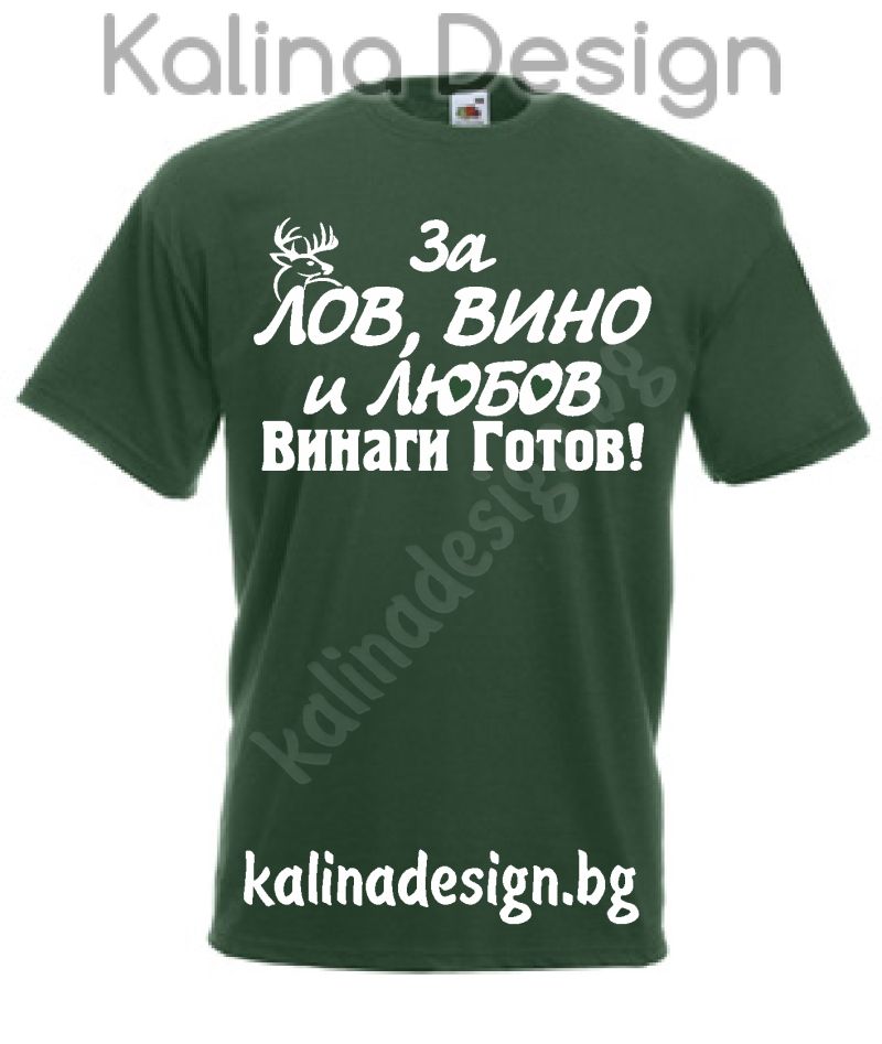 Забавна тениска за Ловец с надпис: "За ЛОВ, ВИНО и ЛЮБОВ винаги готов!