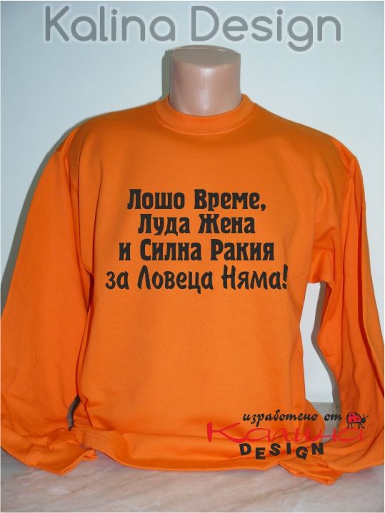 Блуза със забавен надпис - "Лошо време, лудажена и силна ракия за Ловеца няма ".Чудесен подарък за всички ловци с чувство за хумор.