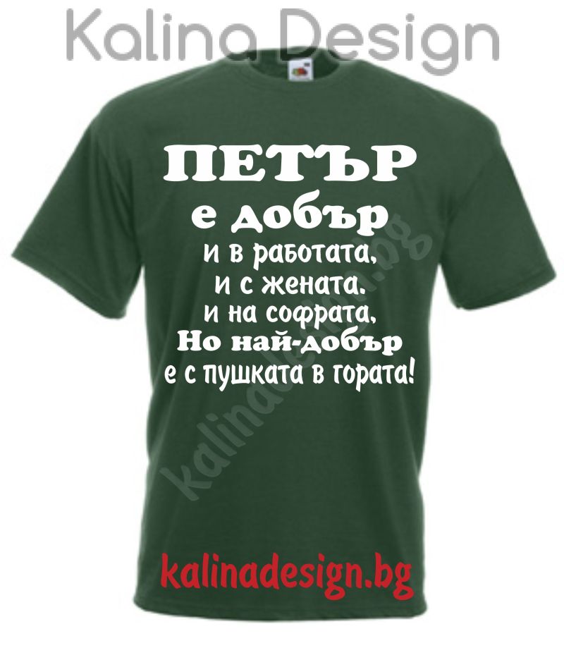 Тениска със забавен надпис - ПЕТЪР е добър....., но най-добър е с пушката в гората!