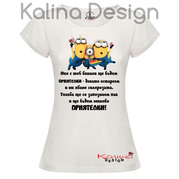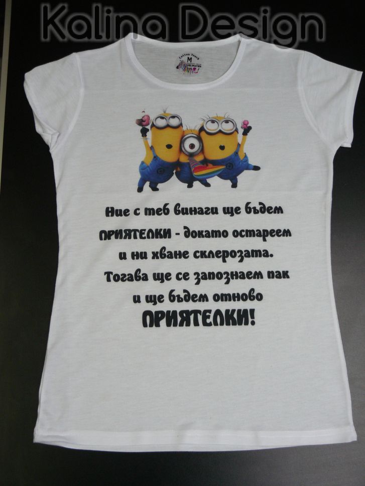 Тениска със забавен надпис за Приятелки и миньони. Прекрасен подарък за всеки повод - имен ден, рожден ден, Коледа и Нова година, юбилей и др. Тениска 100% полиестер, българско производство. Цвят: бял;