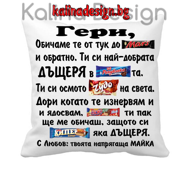 Декоративна възглавничка с надпис - Гери, обичаме те от тук до Марс и обратно. Ти си най-добрата ДЪЩЕРЯ в Републиката. Ти си осмото ЧУДО на света........