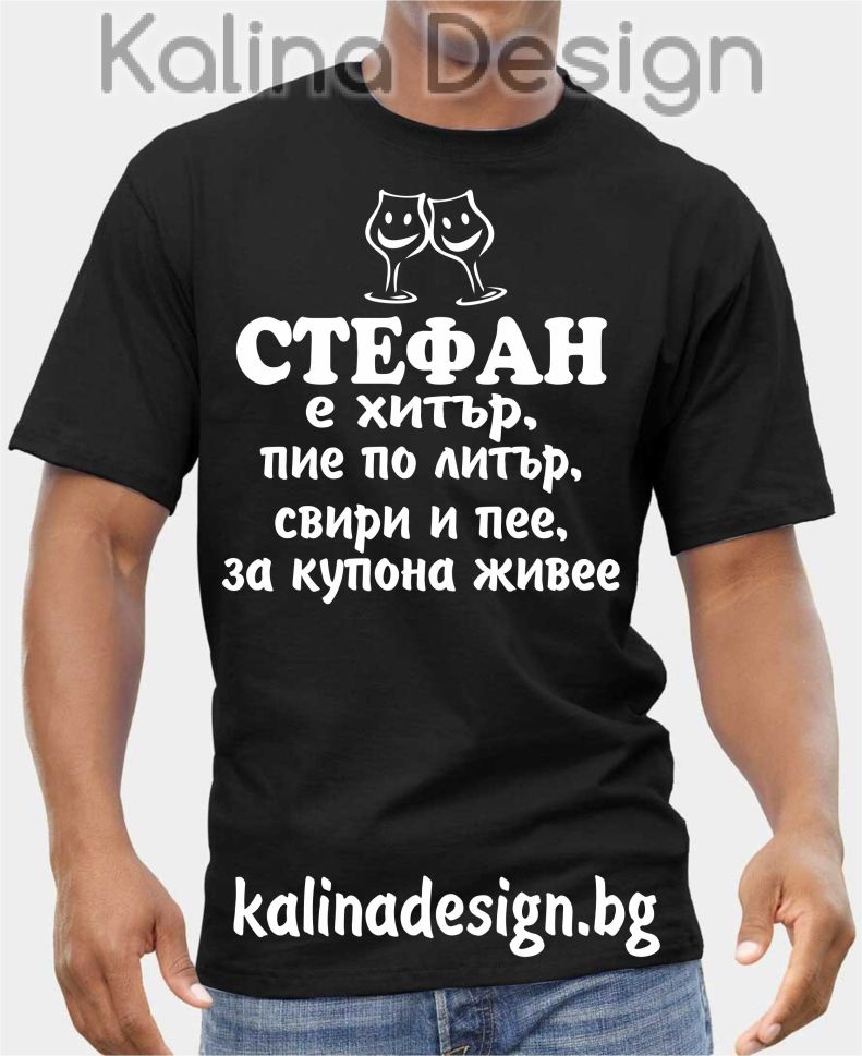 Забавна тениска за СТЕФАНОВДЕН с надпис СТЕФАН е хитър, пие по литър, свири и пее, за купона живее.