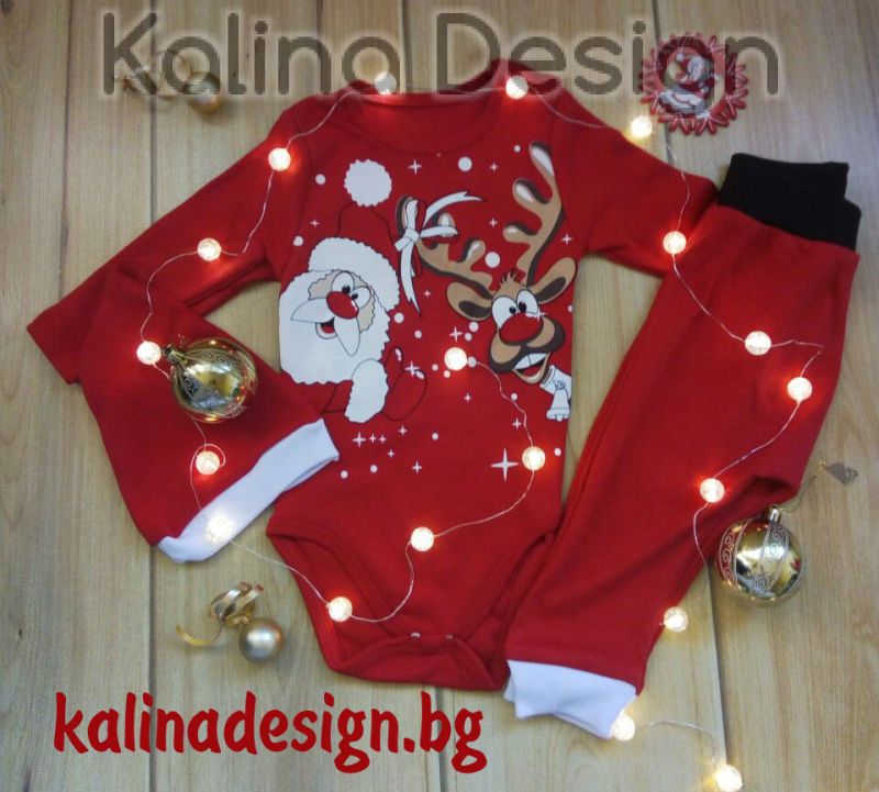 Коледен комплект Бебешко боди дълъг ръкав, панталон и шапка