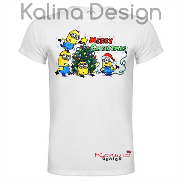 Тениска със забавен надпис Merry Christmas и миньони. Тениска 100% полиестер, българско производство. Цвят: бял; Два варианта - дамски втален модел и мъжки прав;