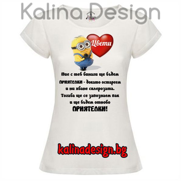 Дамска тениска с надпис за Приятелки и миньони +име Цвети