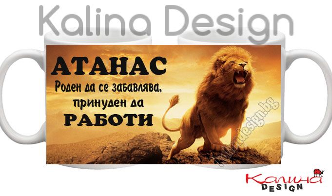 Чаша с надпис АТАНАС Роден да се забавлява, принуден да работи