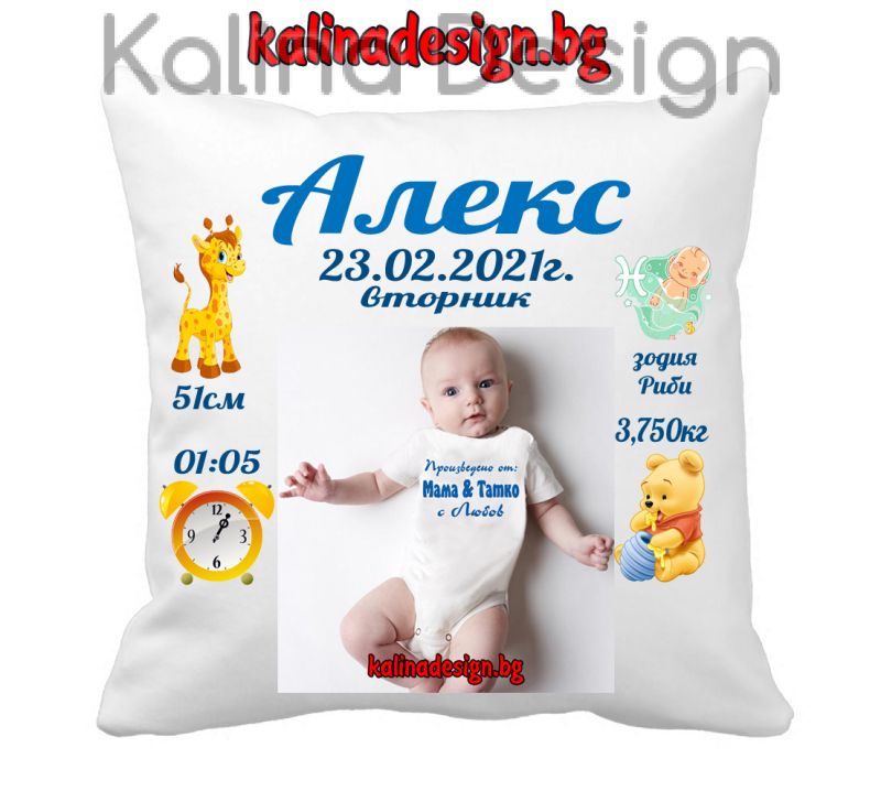 В полетата по-долу може да добавите Ваша снимка и данни за детето, които да бъде отпечатани на възглавничката.