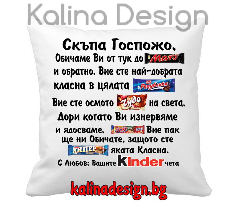 Декоративна възглавничка с надпис - Скъпа Госпожо, обичаме Ви от тук до Марс и обратно. Вие сте най-добрата КЛАСНА в цялата Република. Вие сте осмото ЧУДО на света........