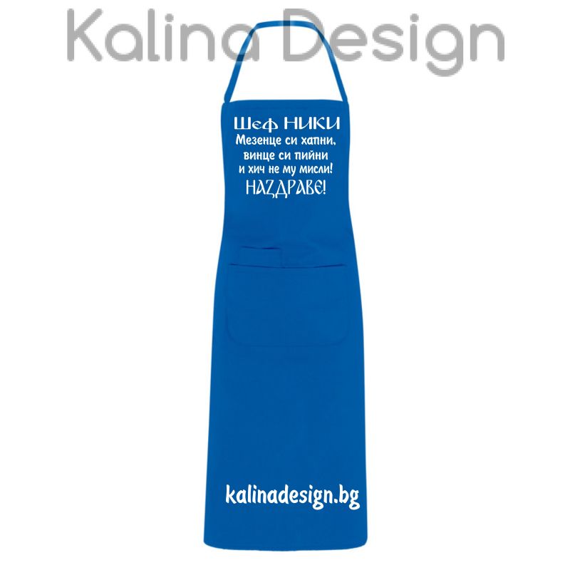 Престилка с надпис Шеф НИКИ мезенце си хапни, винце си пийни и хич не му мисли! НАЗДРАВЕ!