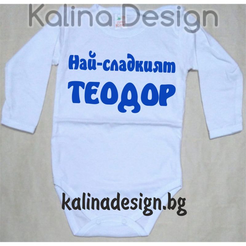 Бебешко боди дълъг ръкав със забавен надпис: Най-сладкият Теодор!