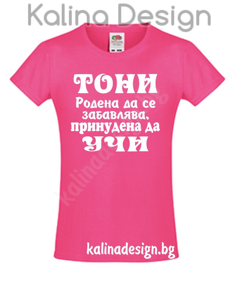 Детска тениска със забавен надпис ТОНИ - родена да се забавлява, принудена да УЧИ