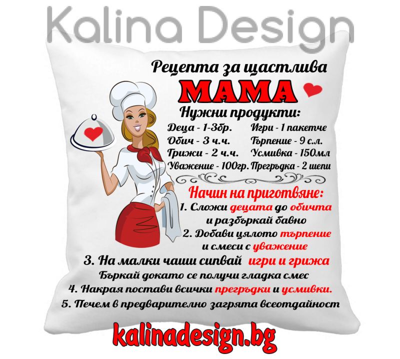 Възглавничка с надпис Рецепта за щастлива МАМА