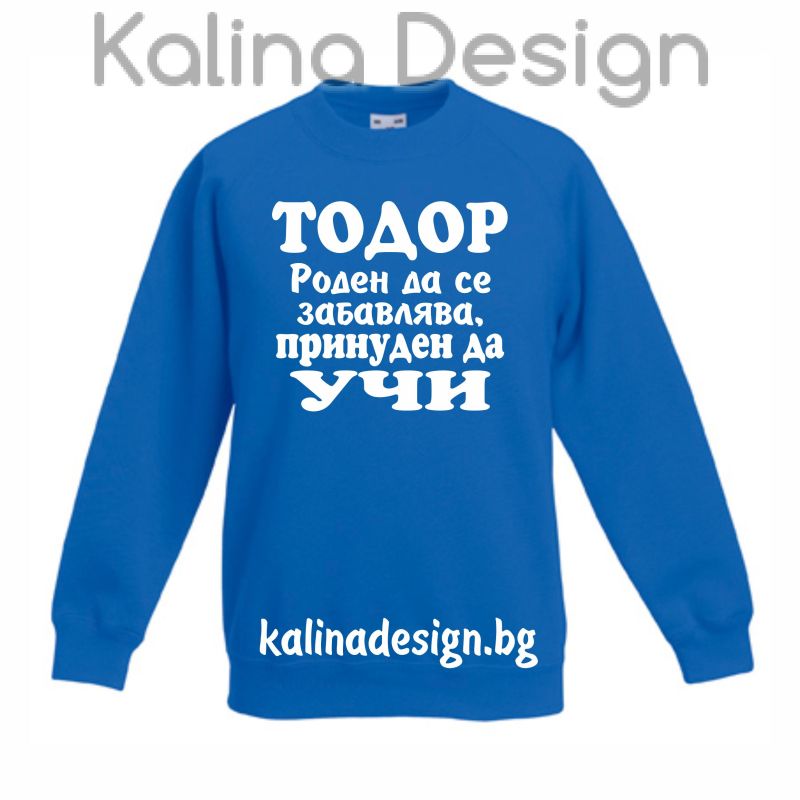 Детска ватирана блуза дълъг ръкав със забавен надпис - ТОДОР - роден да се забавлява, принуден да УЧИ