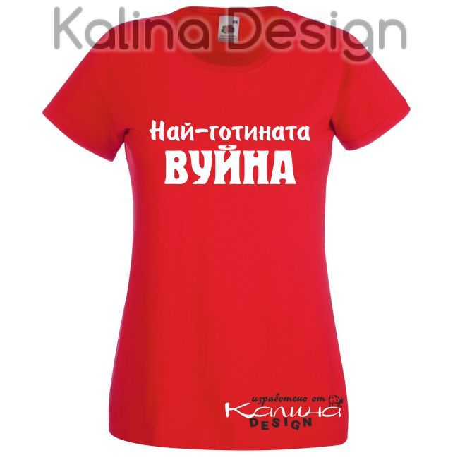 Тениска със забавен надпис - Най-готината ВУЙНА. Прекрасен подарък за всеки повод - имен ден, рожден ден, Коледа и Нова година, юбилей и др. Тениска 100% памук, производител Fruit of the Loom. Щампата е изработена от висококачествено текстилно фолио издръжливо на пране. Дизайн и печат на щампата - Калина Дизайн ЕООД.