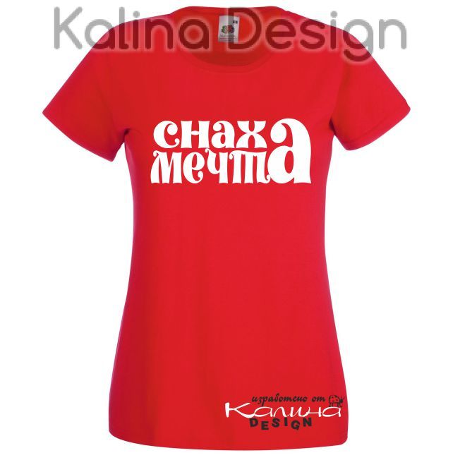 Тениска със забавен надпис - СНАХА МЕЧТА. Прекрасен подарък за всеки повод - имен ден, рожден ден, Коледа и Нова година, юбилей и др. Тениска 100% памук, производител Fruit of the Loom. Щампата е изработена от висококачествено текстилно фолио издръжливо на пране. Дизайн и печат на щампата - Калина Дизайн ЕООД.