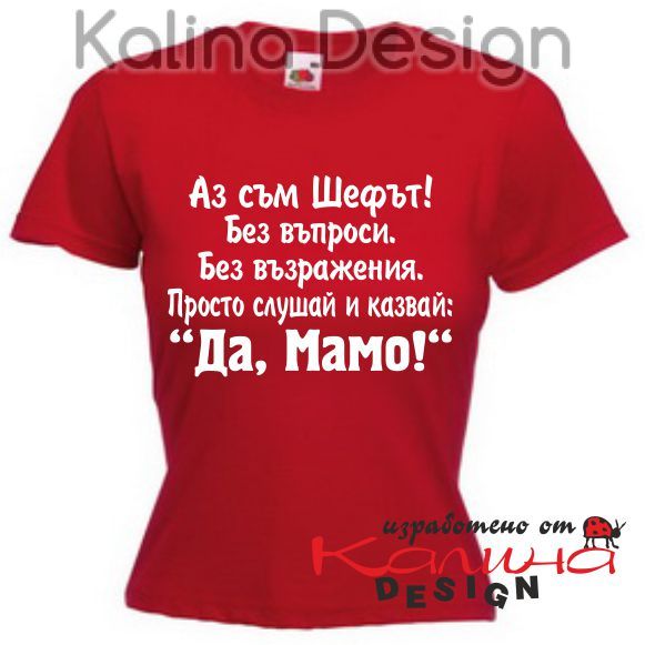 Тениска със забавен надпис - Аз съм Шефът....Просто слушай и казвай: Да, МАМО!. Прекрасен подарък за всеки повод - имен ден, рожден ден, Коледа и Нова година, юбилей и др. Тениска 100% памук, производител Fruit of the Loom. Щампата е изработена от висококачествено текстилно фолио издръжливо на пране. Дизайн и печат на щампата - Калина Дизайн ЕООД.