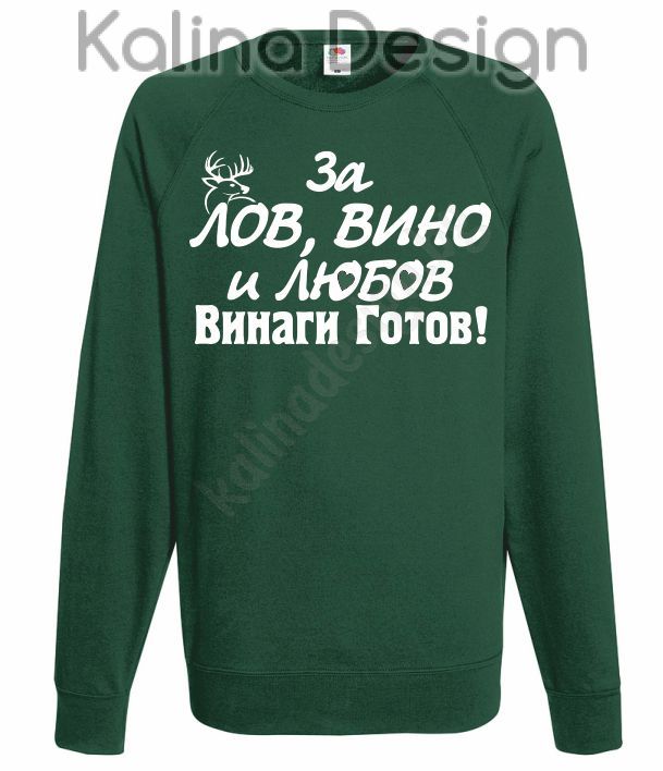 Блуза със забавен надпис - "За Лов, Вино и Любов винаги готов".Чудесен подарък за всички ловци с чувство за хумор.