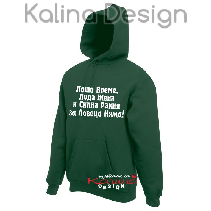 Суитчър за Ловци с забавен надпис "Лошо време, Луда жена и силна ракия за Ловеца няма". Чудесен подарък за всички ловци с чувство за хумор - за имен ден, рожден ден, юбилей, откриване на ловния сезон и други поводи. Ежедневeн и елегантeн суитчър от двуконечна вата Classic с джоб тип кенгуру, с двойна качулка и връзки в същия цвят. Производител Fruit of the Loom. Щампата е изработена от висококачествено текстилно фолио издръжливо на пране. Дизайн и печат на щампата - Калина Дизайн ЕООД.